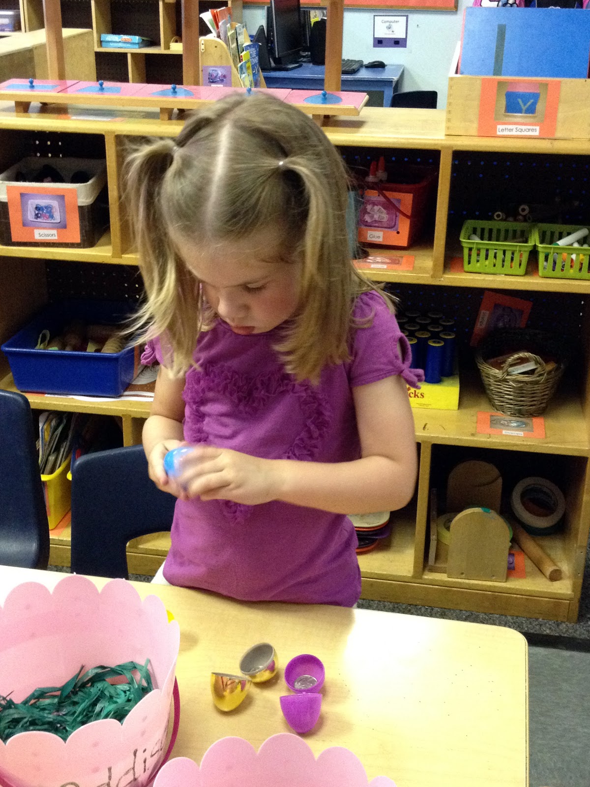 After the snack party they went on the hunt for Easter eggs hidden outside. Each were allowed four eggs. Addison found the golden egg. None of the eggs were stuffed with goodies, but the teachers let them put one quarter in each egg when they got back inside. Addison got three extra quarters in her golden egg.